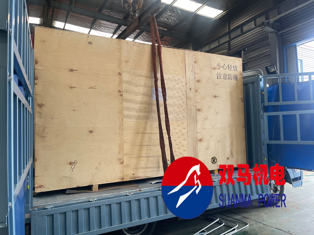 客戶國(guó)外項(xiàng)目訂購(gòu)的800kva今日到工廠提貨裝車發(fā)運(yùn),800kva濰柴動(dòng)力木箱包裝后尺寸3850*1720*2320mm,整套機(jī)器5000KG.
